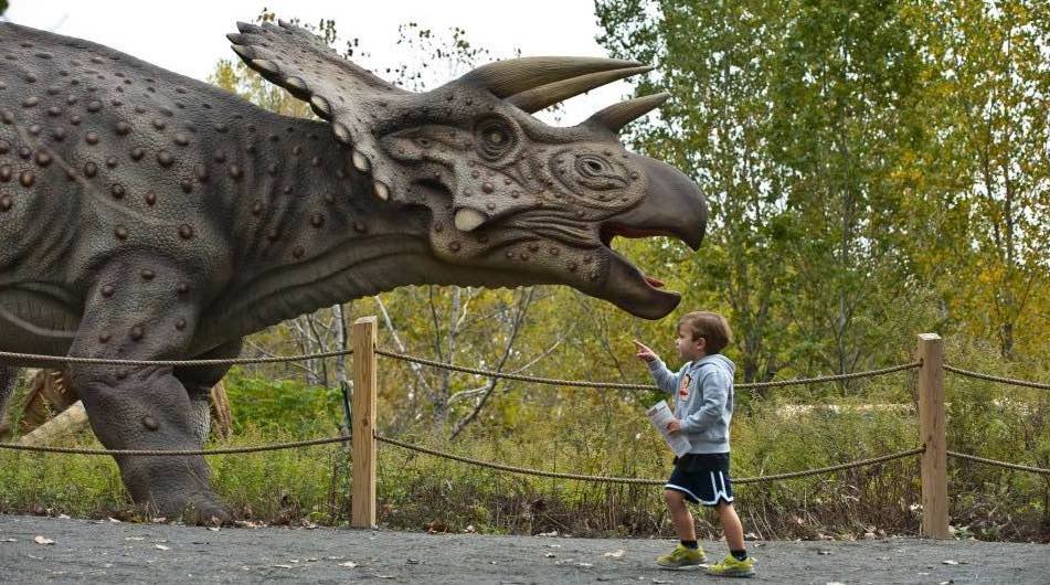 A child with a triceratops at Field Station: Dinosaurs. And a wild animal yard display.