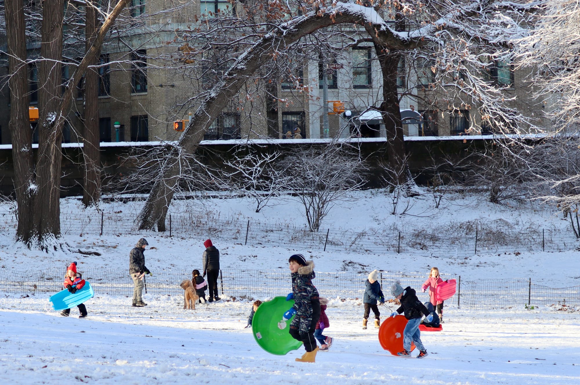 Today’s snow was the first of the season in New York and on a Sunday, no less. So the hills of Central Park were filled with snow-suited children, and there was a giddiness even to the adults, not yet weary of winter. I passed by a man who, as I walked by, was exclaiming to someone on the phone, “The kiddos are all out sledding and there’s cute dogs playing everywhere!” Two teenage girls had brought a giant bin and were in the midst of building an impressive snow fort. And, when I passed by Belvedere Castle, the wind kicked up creating a fresh dusting, while music drifted through the air along with the snow, carried from somewhere else in the park. There are occasionally days in New York that actually do feel like the movie version of the city and this was one.