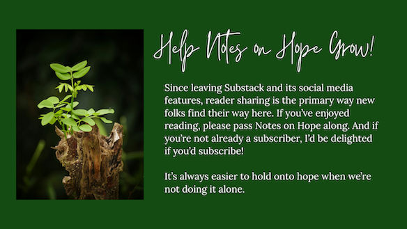 So, what are the habits of mind, heart, and pragmatic action that make it most likely we will be among the third group—those who are able to acknowledge the sharpness of the broken pieces and work toward repair, rather than self-protection or greater brokenness. In a way, this is the central question that I started writing Notes on Hope to try to answer. Joy, even in the smallest slivers, and especially when it is shared, must be part of the answer. We can only work to repair harm if we can begin to imagine what wholeness might look like for everyone. The starting point for that imagination lies in recognizing the traces of joy and beauty and connection in our own experience—the little flashes of color that glimmer and shine and fill us with purpose, even among all the jagged shards.